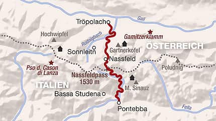 Die Auffahrt vom Obergailtal ist zuweilen steil, die Straße aber gut ausgebaut und schön flüssig. Hinter der Passhöhe ist eine rauere Gangart angesagt. Der Straßenbelag mit Buckeln, Rissen und Scharten verlangt volle Aufmerksamkeit. In zahlreichen engen Kehren (eine davon sogar in einem Tunnel) zieht sich die schmale Piste durchs Tal wie ein mit der Axt in die Berge gehauener Kanal.