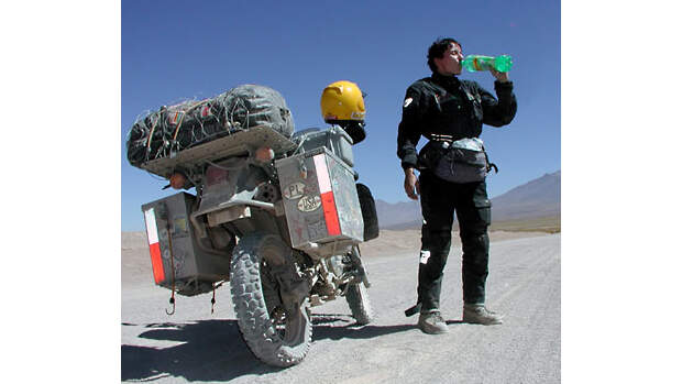 Die Reaktion des Jungen ist für mich keine Besonderheit mehr. Ganz im Gegenteil ich habe mir den Umstand, dass eine allein auf einem Motorrad reisende Frau überall auf der Welt noch immer etwas Besonderes zu sein scheint, in den vergangenen 19 Monaten meiner Reise zwischen Alaska und Feuerland, in Europa und im Norden Afrikas schnell zunutze gemacht der Überraschungseffekt hat mir bei einigen brenzligen Situationen sehr geholfen. In Kolumbien etwa ließ man mich, sobald ich den Helm abgesetzt hatte, recht schnell und unbehelligt die unzähligen Straßensperren und Blockaden passieren, die von der Polizei oder Armee und manchmal sogar von Guerillas errichtet waren. Auch in den meisten anderen Ländern, die ich während meiner bisher knapp 85000 Kilometer weiten Reise kennen lernte, half der Frauen-Bonus sehr.
