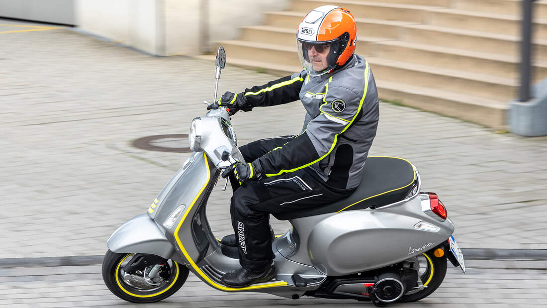 Sie liegt satt auf der Straße und erfreut durch überzeugenden Federungskomfort. Ob die Piaggio-Leute wohl absichtlich Kopfsteinpflasterstrecken ausgesucht haben? So jedenfalls muss ein Fahrwerk funktionieren. Vespa-Kenner überrascht das nicht, auch die elektrische fährt eben wie eine Vespa. Die Bedienung gibt ebenfalls keine Rätsel auf, nur in die Menü- führung für die Einstellungen muss man sich einfuchsen. Es macht Spaß, mit der leise sirrenden Vespa durch den Stadtverkehr zu rauschen, obgleich man dabei nicht allzu frech werden sollte – die meisten Autos beschleunigen besser.