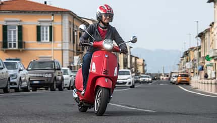 Die wichtigste Neuerung des 2018er-Modells besteht in den Zwölf-Zoll-Rädern, die an die Stelle der bisherigen Elf-Zöller treten. Sie verleihen dem Roller mehr Stabilität, sei es in Kurven, sei es beim Kontakt mit den üblichen Hindernissen in der City, von Straßenbahnschienen über Kanaldeckel bis zu Schlaglöchern; komfortabler fühlt sich die Primavera dank der größeren Räder auch noch an. Der luftgekühlte Dreiventilmotor wurde mechanisch und elektronisch stark überarbeitet, Leistung und Drehmoment bleiben mit 10,7 PS und 10,4 Nm aber gleich. In der Stadt reicht das locker, zumal die Vespa Primavera 125 mit ihren 126 Kilogramm recht leicht und zudem überaus wendig ist. Weniger prickelnd fällt der Fahreindruck auf der Landstraße aus, denn die 91 km/h Spitze reichen kaum zum Überholen, sodass der Roller oft hinter behäbigen Liefer- oder Lastwagen herhechelt. Also lieber nur in Ausnahmefällen das städtische Terrain verlassen, denn dort fühlt sich die Primavera pudelwohl, wedelt beschwingt durch dichten Verkehr und findet in der kleinsten Lücke vor der Eisdiele genug Platz zum Parken – aber nur auf dem Hauptständer, ein Seitenständer kostet extra. Im Preis inbegriffen sind immerhin modernes LED-Licht vorn und hinten.