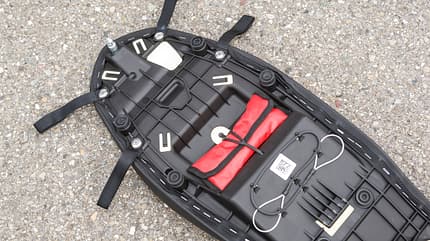 Da Gepäckhaken nicht zur Supermoto-Optik passen, bieten vier an die Sitzbank geschraubte Riemen die Chance, das Gepäck zu verzurren.