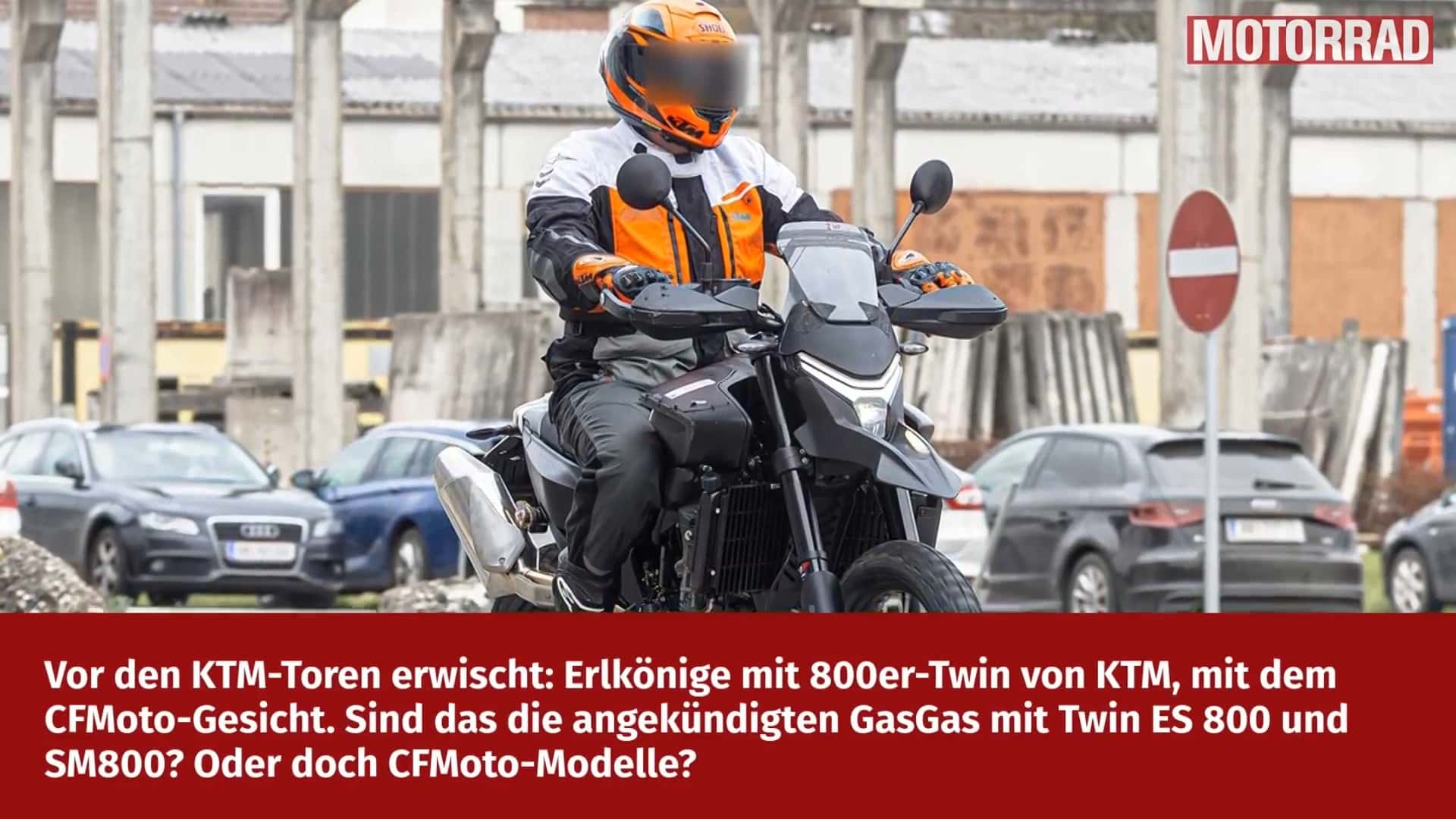 Bereits 2021 standen neue Modelle von GasGas mit dem 800er-Twin von KTM im Raum. Da überraschen die beiden Erlkönige, vor den Toren von KTM erwischt, nicht. Klar zu erkennen ist der Twin mit 790 Kubik am alten Zylinderkopf und Gehäuse. Kolportierte Modellnamen sind ES 800 und SM 800 für eine Enduro mit 19-Zoll-Vorderrad und eine Supermoto mit 17-Zoll-Rädern. Die Überraschung trägt Schnabel. Und zwar in Form eines LED-Scheinwerfers, der so schnabellos an der CFMoto 800 NK zu sehen ist. Trotzdem: MOTORRAD geht von den neuen ES 800 und SM 800 von GasGas aus.