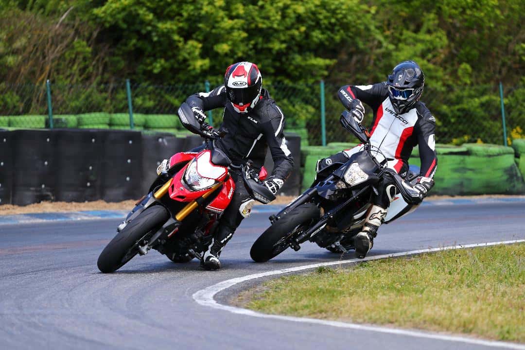 Auch nicht auf der Hypermotard, die lange mithalten kann, irgendwann aber doch dem höheren Gewicht und der nicht ganz so spitzen Geometrie Tribut zollen muss. Sie fährt sich eher wie ein sehr leichtes und sehr sportliches Naked Bike, das man bei Bedarf auch mal hart in Schräglage drücken kann, aber nicht muss. Neu bei Hyper numero tre ist, dass die Ducati nicht mehr unvermittelt in die Kurve fallen will. Im Alltag lässt sie sich nun mit überschaubarem Einsatz bewegen, und zwar innerhalb eines sehr großen Tempo- und Dynamikspektrums. Sehr handlich, sehr stabil, sehr stark und trotz aller Dynamik sehr viel gelassener als der ungestüme Floh aus Mattighofen, der auch hier sein kleines Mehr an Dynamikpotenzial mit einem großen Weniger an Vielseitigkeit erkauft. Da ist sie also, die Kartstrecke. Ob dieser kleine Abstand wohl auch dort – immerhin true Supermoto territory – Bestand hat? Kurze Antwort: Ja, nur wird er größer.