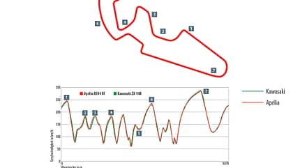 Auch beim Beschleunigen war die Aprilia RSV4 RF besser, dank des höheren Drehmoments im unteren und mittleren Bereich. Wer die Kawasaki ZX-10R optimieren möchte, konnte mit einer etwas kürzeren Übersetzung spürbare Fortschritte machen. Im Anflug auf Punkt Nummer sieben, dem Bremspunkt am Ende der Bergabgeraden, bringen der Leistungsvorteil der Aprilia und ihre bessere Aerodynamik sichtlich mehr Topspeed.