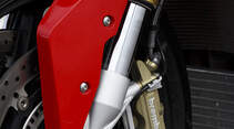 Der Vergleich mit einer anderen Aprilia RSV4 RF aus dem Fundus der Metzeler-Tester ergab später, dass der Hebel der MOTORRAD-Testmaschine weiter zum Lenker hin gebogen war. Nach dem Tausch der Hebel blieb der Druckpunkt zwar konstant weiter vorn, doch begann die Bremse bei anhaltender starker Verzögerung zu rubbeln. Die Aprilia besitzt die dünnsten Bremsscheiben des Feldes und die Radialpumpe mit dem kleinsten Kolbendurchmesser. Dicker und größer wäre bei hoher Belastung besser.