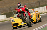 zu besiegen ist. Besonders deutlich wird der Vorteil des Motorrads beim Bergauf-Beschleunigen nach der Dunlop-Kehre. Auf den wenigen 100 Metern schafft es das Bike, das Tempo von 54 auf 190 km/h zu steigern, der Supersportwagen müht sich von 75 auf 153 km/h.