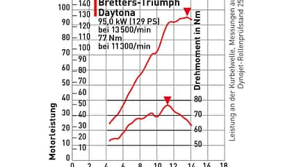 Allerdings hatte er vor allem Hobbyfahrer im Sinn und impfte dem Triple im mittleren Drehzahlbereich mehr Drehmoment ein, während er der Bretters-Triumph Daytona 675 obenherum etwa zwei PS Spitzenleistung nahm. Bei Ex-IDM-Supersportfahrer Pascal Eckhardt stieß das auf Unverständnis, denn mittlere Drehzahlen spielen für die Power-Orgler der 600er-Klasse gar keine Rolle, während Langstrecken-Pilot René Raub durchaus etwas damit anfangen konnte. „Es fährt sich über längere Turns einfach entspannter“, war sein Argument. Sicher tut sich ein ungeübter Fahrer leichter mit weniger hohen Drehzahlen, weshalb wir diese Eigenart des Motorrads dem jeweiligen Kundenwunsch überlassen. Dass sich die verzögerte Gasannahme am zweiten Tag erledigt hatte, sprach für den Tuner und 129 PS sind auch so ein Pfund.