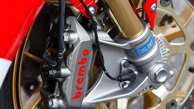 radial angeschlagenen Vierkolben-Festsätteln vorn, 220-mm-Einzelscheibe mit Einkolben-Schwimmsattel hinten, ABS.
