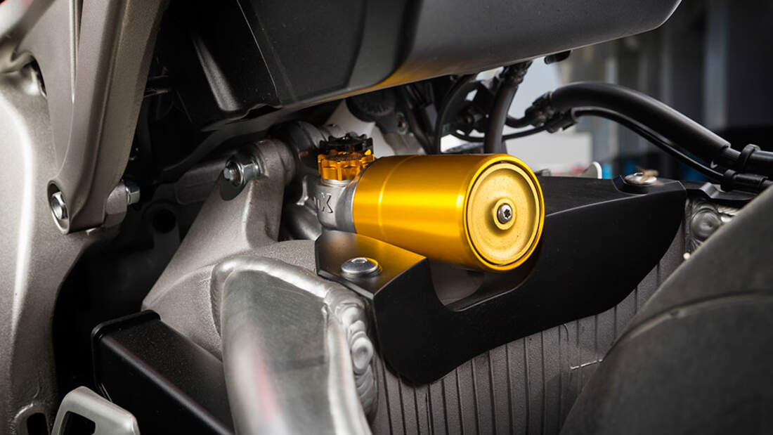 Ihre Öhlins-Gabel hat einen Millimeter mehr Standrohr-Durchmesser als das Showa-Pendant der Basis, steckt außerdem in einer CNC-gefertigten oberen und einer überarbeiteten unteren Gabelbrücke, die durch ein Steuerrohr aus Stahl mit nur zwei Millimeter Wandstärke verbunden sind.