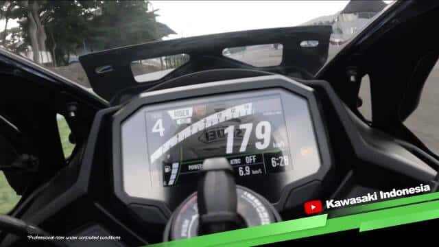 Kawasaki Indonesien fuhr die neue Kawasaki Ninja ZX-4R auf dem Sentul International Circuit in Indonesien und filmte das Erreichen von 207 km/h im 5. Gang. Bereits ab gut 195 km/h nahm die Beschleunigung ab, stieg allerdings tapfer weiter. Die Fahrt endete abrupt und schloss mit der Frage, was im 6. Gang möglich wäre. Rechnerisch sind mit den maximal 80 PS um die 230 km/h möglich, doch mit steigenden Luft- und Rollwiderständen plus steigendem Schlupf am schmalen Hinterrad, bleibt es bei der Theorie. Vermutlich wird die ZX-4R im 6. Gang eher wieder etwas langsamer oder hält die Geschwindigkeit.