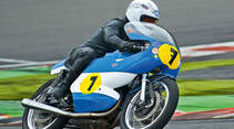 Die berühmten Bianchi-Zweizylinder aus Bologna belebten einst die internationale Rennszene. Bei unserem Fotomodell handelt es sich um die 500er der Familie Ilmberger, die auch noch eine 250er und 350er ihr Eigen nennt. Außer der himmelblauen Lackierung ist die ungewöhnliche Form der „Double Bubble“-Verkleidung charakteristisch. Der ursprünglich flachere Tank wurde für mehr Reichweite vergrößert.