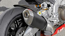 Leichtmetall-Gussräder, 3.50 x 17"/6.00 x 17", Reifen vorn: 120/70 ZR 17, hinten: 190/55 ZR 17, Testbereifung: Pirelli Diablo Rosso Corsa, 320-mm-Doppelscheibenbremse mit Vierkolben-Festsätteln vorn, 210-mm-Einzelscheibe mit Vierkolben-Festsattel hinten