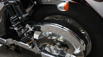 Jedenfalls wirkt es so, wenn sich ihre Besitzerin in den Sattel schwingt. Alles sieht so leichtfüßig und entspannt aus, selbst eine Notbremsung infolge eines unachtsamen Autofahrers stellt die Fahrerin keine Sekunde vor ernste Probleme. Apropos Bremsen: Auf ihren Pass-Exkursionen stellte sich heraus, dass die Bremsanlage mit dem Gewicht der Boss Hoss überfordert war. Zumindest wenn man die Ami-Stühle bewegt wie normale, dynamische Motorräder, neigen die Stopper zu Fading. Das bedeutet, dass Susanne und Volker leistungsfähige Verzögerungswerkzeuge brauchen. Und was schwebt ihnen da vor? „Porsche-Bremsen.“ Kein Scherz, bald kommen Sättel und Scheiben aus dem 911er an die Bosse. Dabei wird es nicht bleiben, denn Susanne möchte noch diverse Details ändern, damit sie die Maschine noch inniger genießen kann.