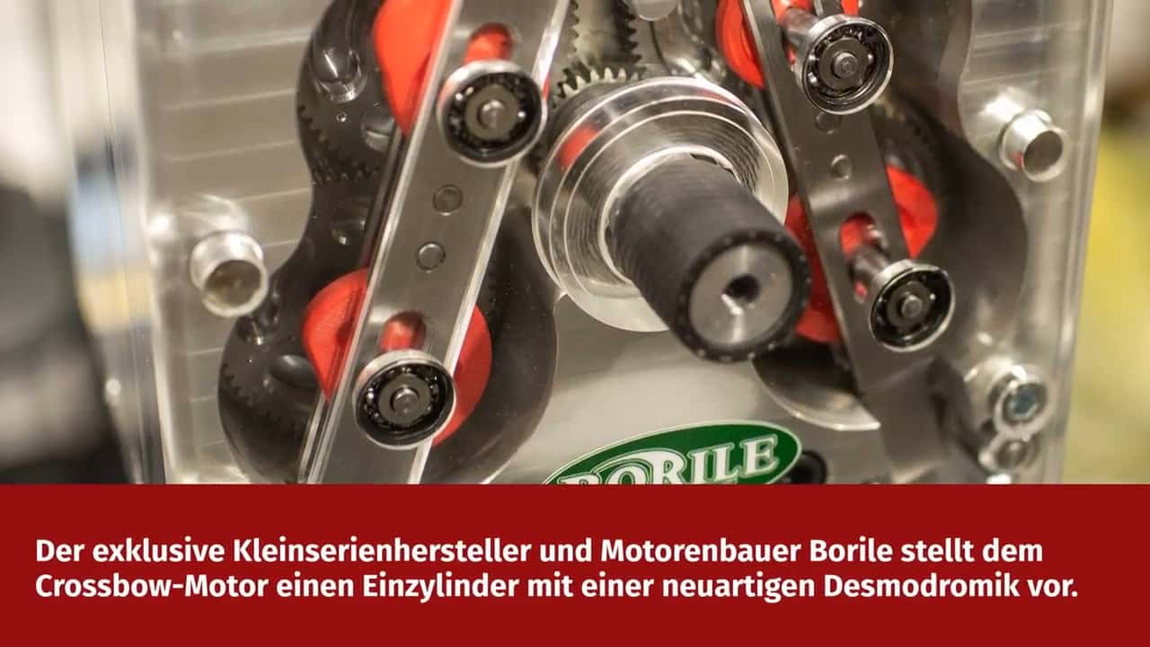 100 Jahre Desmodromik stehen 2024 im Kalender. Und da passt es gut, dass der italienische Kleinserienhersteller Borile, gegründet von Umberto Borile, mit dem Crossbow-Motor eine neue Form der Zwangssteuerung der Ventile entwickelt hat. Interessant an der Borile-Desmo: Durch den Einsatz von Schubstangen aus Titan und leichten Kugellagern sind die bewegten Massen und die Gleitreibung der Teile sehr gering. An einem Einzylinder zeigte Borile das System Mitte Januar 2024 in Italien. Der Name des Motors ist Crossbow.