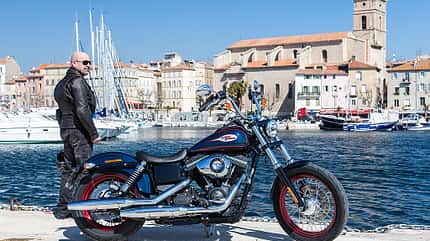 Wer genauer hinschaut, stellt fest, dass Teile wie Ölausgleichsbehälter oder Schwinge nahezu baugleich mit jenen sind, die auch schon im Rocker-Modell zum Einsatz kamen. Hier macht sich Harleys Baukastensystem bezahlt. Die geführte Tour zieht sich gottlob nicht nur über endlose Geraden und durch Marseiller Autostaus, sondern auch über verwundene kleine Straßen im Hinterland, in die der Winter seine Krallen geschlagen hat. Um es kurz zu machen: Natürlich hat der Hinterreifen ein starkes Aufstellmoment, die Lenkgeometrie ist alles andere als kehrenfreundlich und die Schräglagenfreiheit arg begrenzt, doch ein erfahrener Pilot wird seinen Spaß haben. Die Harley-Davidson Breakout kann dynamischer bewegt werden, als man vermutet.