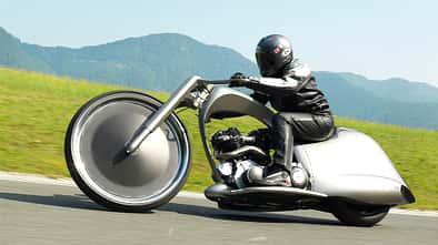 Ein Vorderrad, das aussieht wie der Mond, ein pneumatisches Fahrwerk, das den Seitenständer...