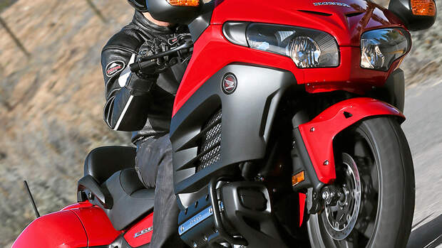 Überraschend, wie gut austariert dieser Brummer durch die Wechselkurven wedelt. Die Bridgestone Exedra-Reifen in 130er- und 180er-Breite funktionieren gut. Gegenüber der schon rund rollenden Gold Wing wirkt das Handling leichter. Easy Rider in der Sumo-Klasse. Auf Landstraßen wie im Stadtverkehr, wo die F6B auch bei Grün heftiger aus den Puschen kommt als die massigere Gold Wing. Bis 42 Grad Schräglage seien möglich, sagen die Honda-Mannen. Könnte stimmen.