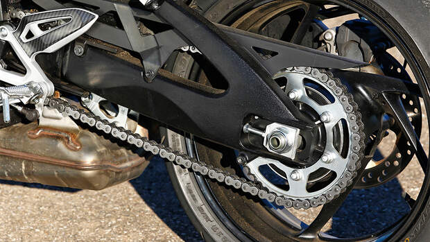 Merkmale eines günstigen Landstraßensportlers: einfache Schwinge, Kettenantrieb. Leicht, günstig, mehr Pflege.