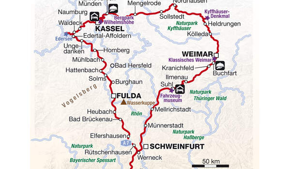Lohnenswert: die Besichtigung des Weltkulturerbes Würzburger Residenz samt der barocken Gartenanlage, drum herum Abstecher zu Top-Motorradstrecken der Fränkischen Schweiz. Prost: Franken hat die höchste Brauereidichte der Welt! Weiter nördlich warten die Kurvenreviere von Rhön und Wasserkuppe. Rings um den Edersee kommen viele Motorradfahrer zusammen, etwa am Motorradtreff "Zündstoff" im US-Stil. Sehenswert sind das auf dem Kopf stehende "tolle Haus" in Edertal-Affoldern und Burg Waldeck mit Restaurant und herrlichem Blick über den Stausee. Ferner die Fachwerkstädtchen Fritzlar und Naumburg. In Kassel-Bad Wilhelmshöhe lockt der 300 Meter hohe Bergpark als Deutschlands jüngstes Welterbe. Vom 1. Mai bis zum 3. Oktober erstrecken sich mittwochs sowie sonn- und feiertags spektakuläre Wasserspiele mit 300 Jahre alter Technik über rund 1,5 Kilometer: künstliche Wasserfälle, Aquädukte und 50 Meter hohe Endfontäne. Übernachtungstipps: das rustikale Hotel "Papen Änne" in historischem Gebäude und mit eigenem Biergarten sowie das "Pentahotel Kassel-Wilhelmshöhe" mit Tiefgarage, schicker Bar und freundlichem Personal.