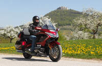 Nur Rückmeldung vom Vorderrad ist Mangelware. Erinnert an diverse BMWs: Man muss sich einfach nur trauen. Etwas weniger sensibel spricht die kardanbewehrte Hinterhand an. Dunlop Sportmax D 423 haften auf trockenen Straßen nicht schlecht. Löblich: Elektronische Reifendruck-Kontrolle und abgewinkelte Ventile. Individuell und edel: Helles Abblendlicht aus zehn LED-Linsen trifft fantastisches Fernlicht. Hinzu kommen große, auf Dauerlicht geschaltete Blinker in den breiten, einklappbaren Spiegeln der Honda Gold Wing. Sie vergrößern die intuitiv sichtbare Frontsilhouette. Falls doch mal ein Autofahrer unachtsam die Bahn kreuzt, kommt eine automäßig laute Hupe zum Einsatz. Bei Notbremsungen pulsieren Rück- und hintere Blinkleuchten.
