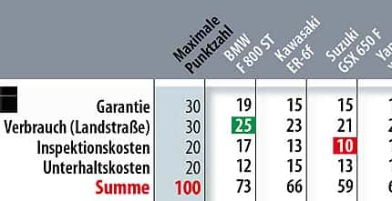 Hier glänzt die BMW mit geringem Verbrauch, niedrigen Inspektionskosten und zusätzlicher Mobilitätsgarantie. Suzuki kalkuliert für die 650er verhältnismäßig hohe Inspektionszeiten ein, Yamaha und Kawasaki sind versicherungsgünstig.