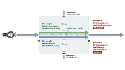 Keine leichte Übung, nach der neuen ECE-Regelung R41 die rechtlich relevanten Fahrgeräusche zu bestimmen. Vorbei die Zeiten, als noch generell über einen Kamm geschert wurde. Für jedes Motorrad gibt es nun individuelle Vorgaben, die auch am Fahrzeug angebracht sein müssen. Unsere Test-BMW ist laut Zulassungsdokumenten mit 75 dB(A) eingetragen. Diese Dezibel-Angabe, die als L (urban), also mehr oder minder Lärm-Wert für den städtischen Verkehr bezeichnet wird, lässt sich allerdings nicht einfach so messen. Unsere Grafik veranschaulicht die Komplexität des neuen Geräuschprüfverfahrens.