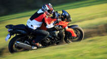 Die Leistungs- und Drehmomentdiagramme unserer sechs Testmaschinen lassen sich in zwei Gruppen unterteilen. Zunächst die "klassischen" Motoren älterer Herkunft bzw. Bauart. XJR, CB 1300 und ZRX 1200 zeichnen bis etwa 7000 Umdrehungen sehr ähnliche Kurven. Um 100 Nm sind in der Zweiradwelt bei so niedrigen Drehzahlen eine echte Bank. Die Kawa legt ab da noch einmal zu, was ihr zu einer höheren Spitzenleistung verhilft, im Alltag aber eher von untergeordneter Bedeutung ist. Die Bandit 1250 besticht mit einem sehr früh anliegenden maximalen Drehmoment. Turbodiesel-Charakter – weiterdrehen bringt nichts. Auf der anderen Seite K 1300 und B-King. Die haben das Quäntchen mehr Hubraum, sind zudem moderner, sportlicher konstruiert. Ganz unten kommt die Bandit noch gut mit, aber ab etwa 3500 Umdrehungen entschwinden beide in andere Sphären. Bemerkenswert ist, dass beide Kurven nahezu identisch verlaufen. Die B-King allerdings ist lang übersetzt, gibt zudem in den unteren Gängen nicht die volle Leistung frei. Diese Drossel kann sich die K 1300 dank Traktionskontrolle sparen.