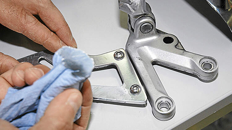 Vorschlag: ein zweiter Eimer mit Klarwasser zum Ausspülen. Bevor es ans Finish geht, sollte man sich wirklich sicher sein, welche Flächen behandelt werden. Vieles, was am Motorrad identisch aussieht, besteht oftmals aus unterschiedlichen Materialien. Zum Beispiel fein glänzende Spiegel- oder Blinkergehäuse – tatsächlich verchromtes Metall oder doch eher verblendeter Kunststoff? Wer sich ohne genaue Prüfung mit einer Metallpolitur ans Werk macht, wird bei Plastik schnell auf Grund gehen! Während sich Wolken oder Schlieren von Polituren auf Lack zwar mühsam wieder herausarbeiten lassen, muss man sich auf durchgefärbten Kunststoffteilen (z. B. Verkleidungskiel, Kotflügel oder Hinterradabdeckung) keine Mühen machen. Diese Flecken bleiben! Weshalb auch gesättigte Poliertücher weder auf Lacken noch Kunststoffen eingesetzt werden sollten (Kratzergefahr bzw. Fleckenbildung).