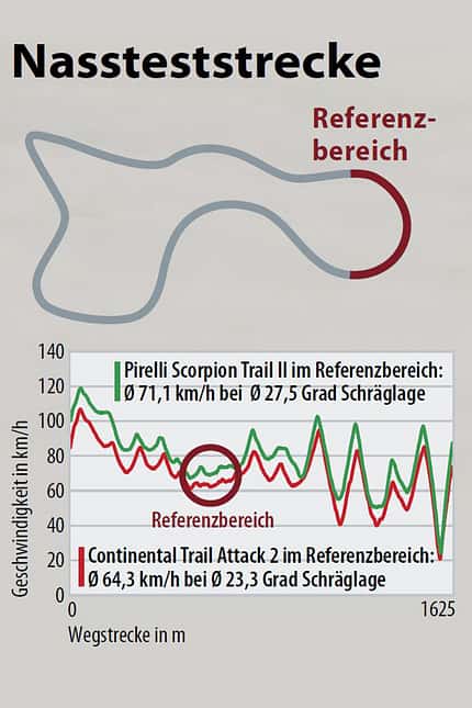| max. Punktzahl | Bridgestone A 40 | Continental Trail Attack 2 | Dunlop Trailsmart | Metzeler Tourance Next | Michelin Anakee III | Pirelli Scorpion Trail II | Gesamtpunktzahl | 150 | 131 | 133 | 128 | 133 | 126 | 137 | Platzierung | 4. | 2. | 5. | 2. | 6. | 1. |