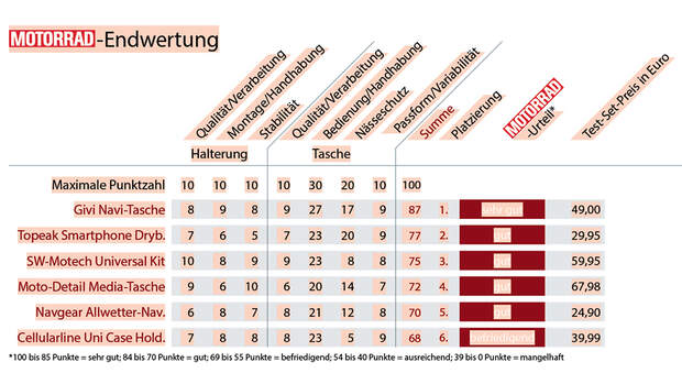 Auch die Halterungen sitzen durchweg passabel. Die größten Unterschiede finden sich beim Nässeschutz. Fazit: geringe Investitionen – ordentlicher Praxis-Nutzen. Den Testsieg schnappt sich am Ende die Givi-Navi-Tasche für 49,00 Euro. Den Titel MOTORRAD-Kauftipp hat sich die Lösung von Topeak redlich verdient. Trotz ihres im Vergleich relativ günstigen Preises landet die Tasche mit 77 Punkten auf dem zweiten Platz.