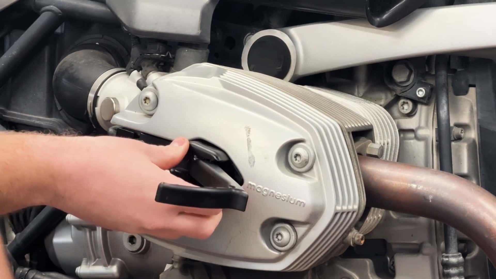 Die nachrüstbaren "Highway-Pegs" für den luft-ölgekühlten Boxer-Motor mit 1.170 Kubik werden in den Kanal des Zündkabels in der Zylinderkopfhaube montiert. Allerdings nicht geschraubt, sondern geklemmt. Eine ziemlich gewagt erscheinende Art der Montage. Dazu wird ein Halter in den sich verjüngenden Kabelkanal geklemmt. Die eigentliche Fußraste wird über den Zündkerzenstecker gestülpt und über den Halter mit 4 Schrauben gegen den geklemmten Halter gezogen. IRM meint, die Schrauben sollten nach der ersten Fahrt nachgezogen werden. Wobei diese Konstruktion genug Spielraum lässt, dass es bei einer Fahrt bleibt und man das Gelump direkt danach wegwirft. Aber bekanntlich: "Nur Versuch macht kluch".