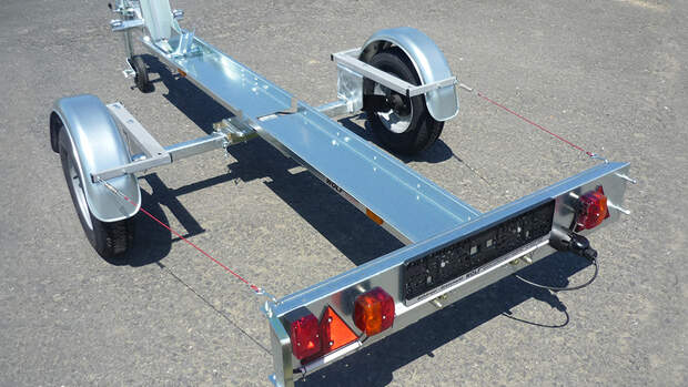Die dänische Anhängermarke hat für den Motorradtransport ein durch die Bank klassisches Modell mit zwei Standschienen plus Bügel und vier Verzurrösen im Programm. Das Eigengewicht beträgt 132 kg, bis zum Erreichen des zulässigen Gesamtgewichts von 750 kg lassen sich 618 weitere Kilos auflasten. Zum Be- und Entladen lässt sich der Leuchtenträger vom verzinkten Chassis abklappen. Stützrad und Verzurrbeschläge sind als Extra erhältlich.