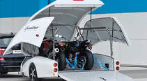 Die süddeutschen BMW-Zubehörspezialisten vertreiben einen Zweiradanhänger, der sich für den Nichtgebrauch mit wenigen Handgriffen komplett zerlegen lässt und mit einem Packmaß von 119 x 57 x 55 cm sogar kofferraumtauglich ist. Der Trailer ist kippbar, eine integrierte Vorderradwippe soll das Handling beim Beladen zusätzlich erleichtern. Der 75 kg schwere Hänger lässt sich mit einem bis zu 375 kg schweren Bike beladen.