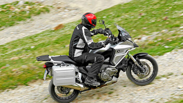 Die Honda fährt auf den Pirellis leichtfüßig-sportiv, erinnert an eine BMW R 1200 GS. Und lässt sich auch weit in die Kurven hineinbremsen. Bei sehr schräger Fahrweise rutschen die Pneus recht früh, doch ganz sanft weg, lassen sich aber gut wieder einfangen. Eigendämpfung (Komfort) könnte beim recht straff wirkenden Vorderreifen größer sein. Reifen für einen 285-Kilo-Tourer gefühlsecht-frech. Insgesamt eher sinnlich, weniger harmonisch.
